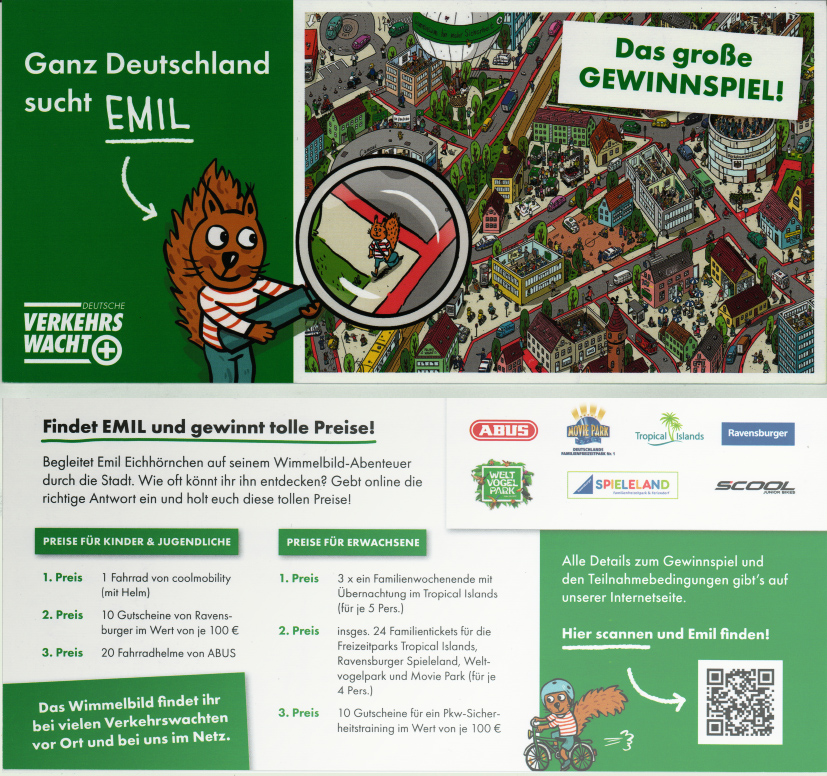 Verkehrssicher in allen Lebensphasen Unfälle vermeiden, Leben schützen: Das ist die Aufgabe der Deutschen Verkehrswacht. Sie greift damit das menschliche Grundbedürfnis auf, auf allen Wegen sicher unterwegs zu sein und unverletzt anzukommen. Die Verkehrswacht kümmert sich um alle Verkehrsteilnehmer, gleich welchen Alters und gleich, wie sie unterwegs sind. Ganz Deutschland sucht EMILDas große GEWINNSPIELHerunterladen, scannen und bei der Deutschen Verkehrswacht nachschauen sowie EMIL suchen. Und das alles schnell, denn der Einsendeschluss ist der 31.10.2025